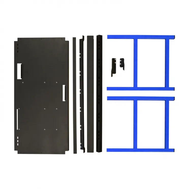 The kit includes a set of self-drilling screws to screw the case together by yourself and a switch for the motherboard. Furthermore, the set does not include the motherboard, risers, graphic cards or screws for their installation.