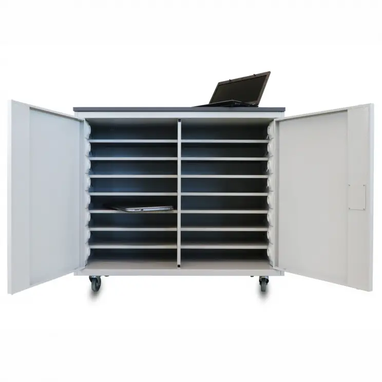 Akyga® AK-NC-16S cabinet is a compact solution for schools and offices. It is designed to safely store, charge and transport mobile computers. Inside it is able to accommodate up to 16 laptops or tablets with a maximum size of 17''. Each notebook has an individual shelf, next to which there is a universal power socket. This makes it possible to charge 16 laptops simultaneously! What is more, the side walls of the cabinet have special ventilation holes. They are responsible for the flow of air inside the rack, which is necessary for the proper work of power supplies.