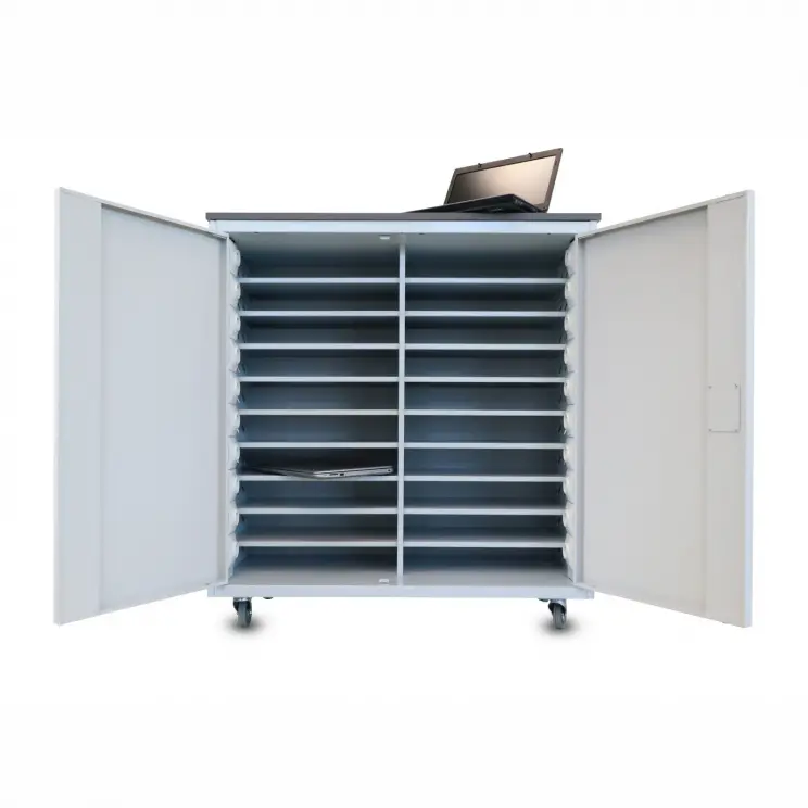 Akyga® AK-NC-20S is a mobile laptop cabinet. It is used to store, charge and transport mobile computers. Inside the cabinet there are 20 places for laptops or tablets up to 17''. On each of the shelves, there is an electrical socket for connecting a power supply. This allows the cabinet to charge all stored laptops at the same time. Therefore, it is ideal for schools, offices or offices where the number of equipment is much greater than in a home office. Moreover, the cabinet is characterised by high quality and durability. Specially reinforced external walls and lockable doors ensure that the stored equipment is protected against unauthorised access and is therefore safe.