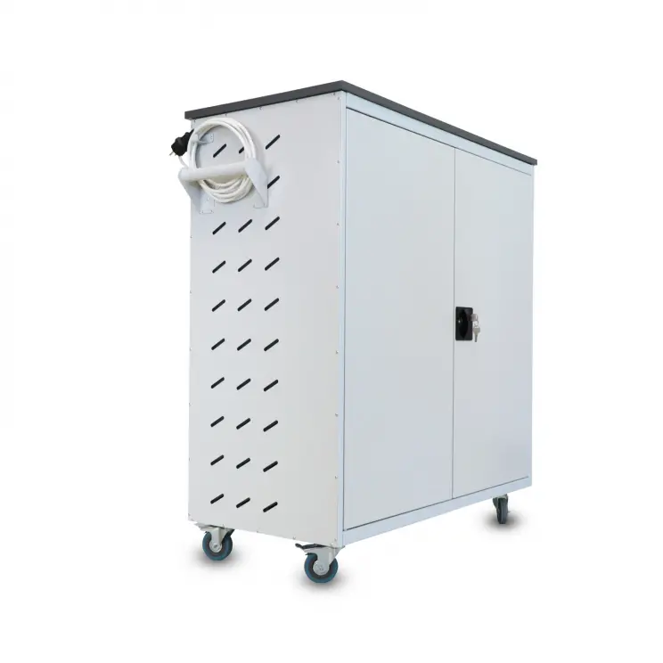 An unquestionable advantage of the cart is that despite its size it is very easy to handle. The mounted wheels and handles make manoeuvring the cabinet between rooms comfortable and can be done by a single person. In addition, for even greater comfort and safety, the main power switch and the sequential system are mounted on the back of the cart. The switch allows for quick power on/off for all laptops. However, the built-in sequencing system protects against surge overload, which occurs when a large number of devices are connected to the mains at the same time. In addition, on the side walls of the cabinet, ventilation holes have been placed. They are responsible for maintaining appropriate air circulation, which is necessary for the correct operation of power supplies.